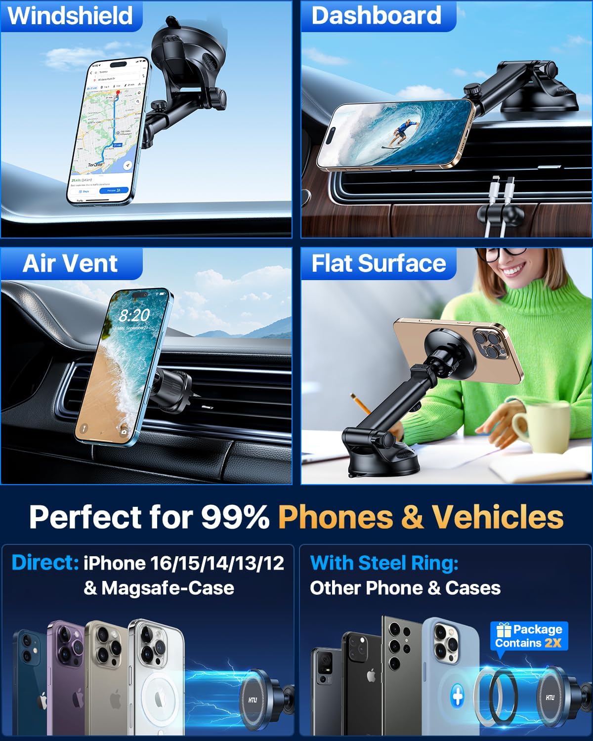 - 【Magnetic Phone Mount for 99% Phone & Phone Case】Our products belong to universal car magnetic cell phone holder,perfect fit for cars, trucks and other special vehicles.This magnetic cell phone mount is compatible with all mobile phones between 4-7 inch,compatible with iPhone 16 Pro Max 15 14 13 12 11 XR X 8 7 SE mini,for Samsung Galaxy S25 Ultra S24 S23 S22 S21 A53 A22 Motorola,etc.