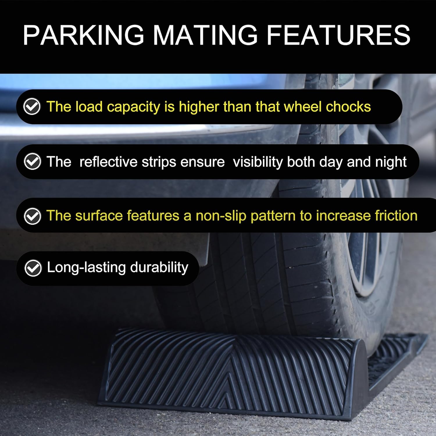 - User-Friendly Design: The parking guide mat features two tire humps—a smaller one to notify you when you're on the mat, and a larger one to signal you to stop
