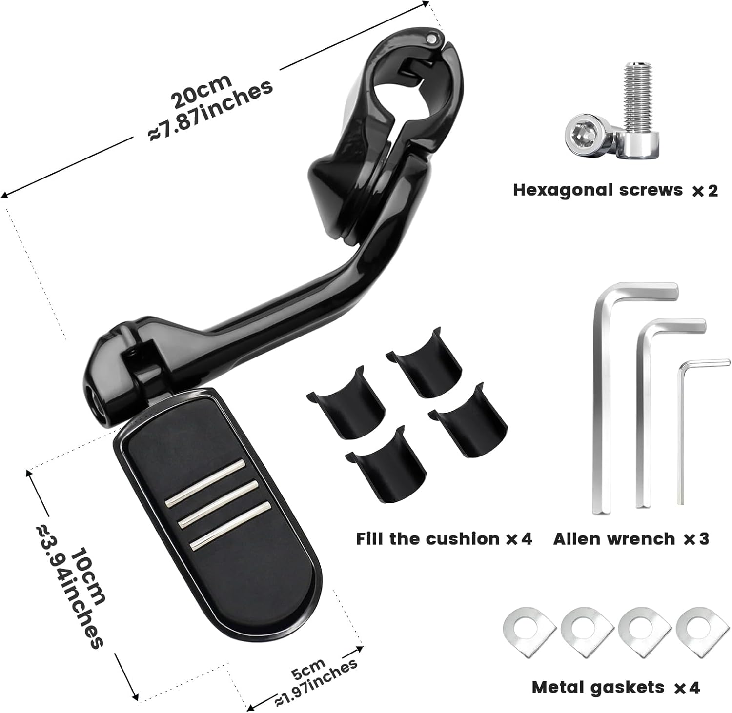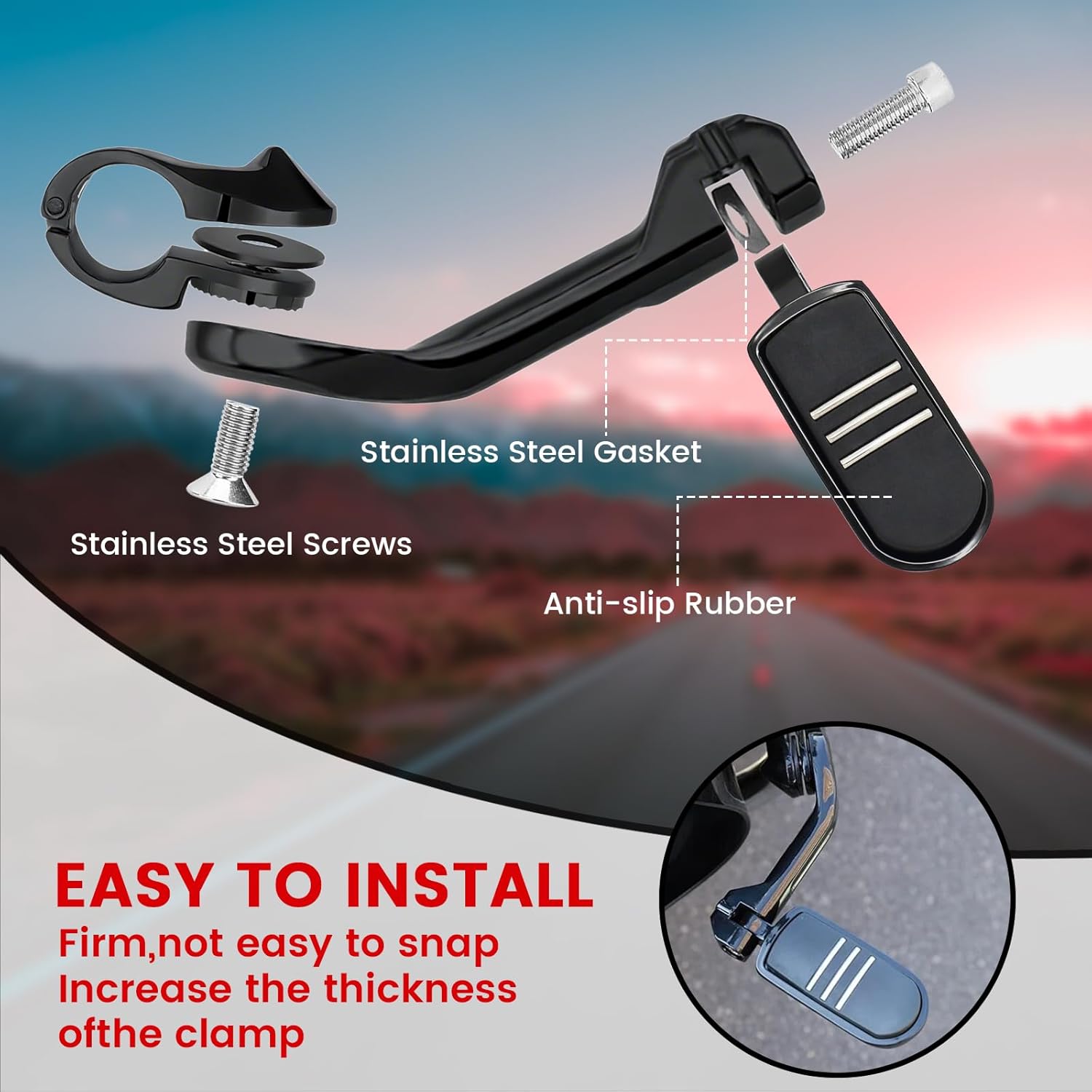 - Easy installation:The item easy to install, No drill installation and mounting clamp firmly grips the engine guard, and secures the peg at the desired angle; Please contact us by Amazon email if you have any questions