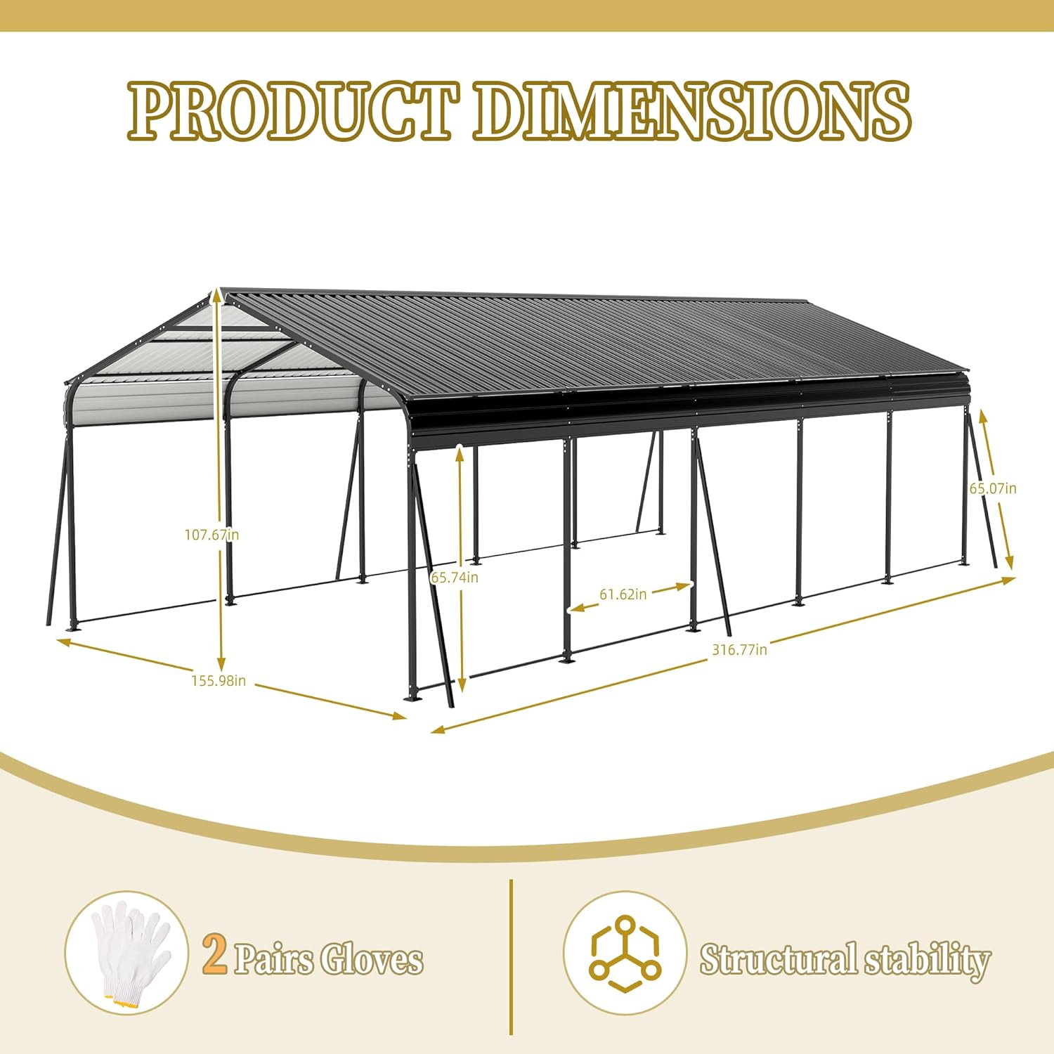 13x26.5 FT Metal Carport, Heavy Duty Car Port Canopy with Galvanized Steel Roof & Frame, Oversized Metal Carport Kit with Hooks, Outdoor 2 Car Garage, Steel Car Shelter for Car, Boat, Truck, Dark Gray