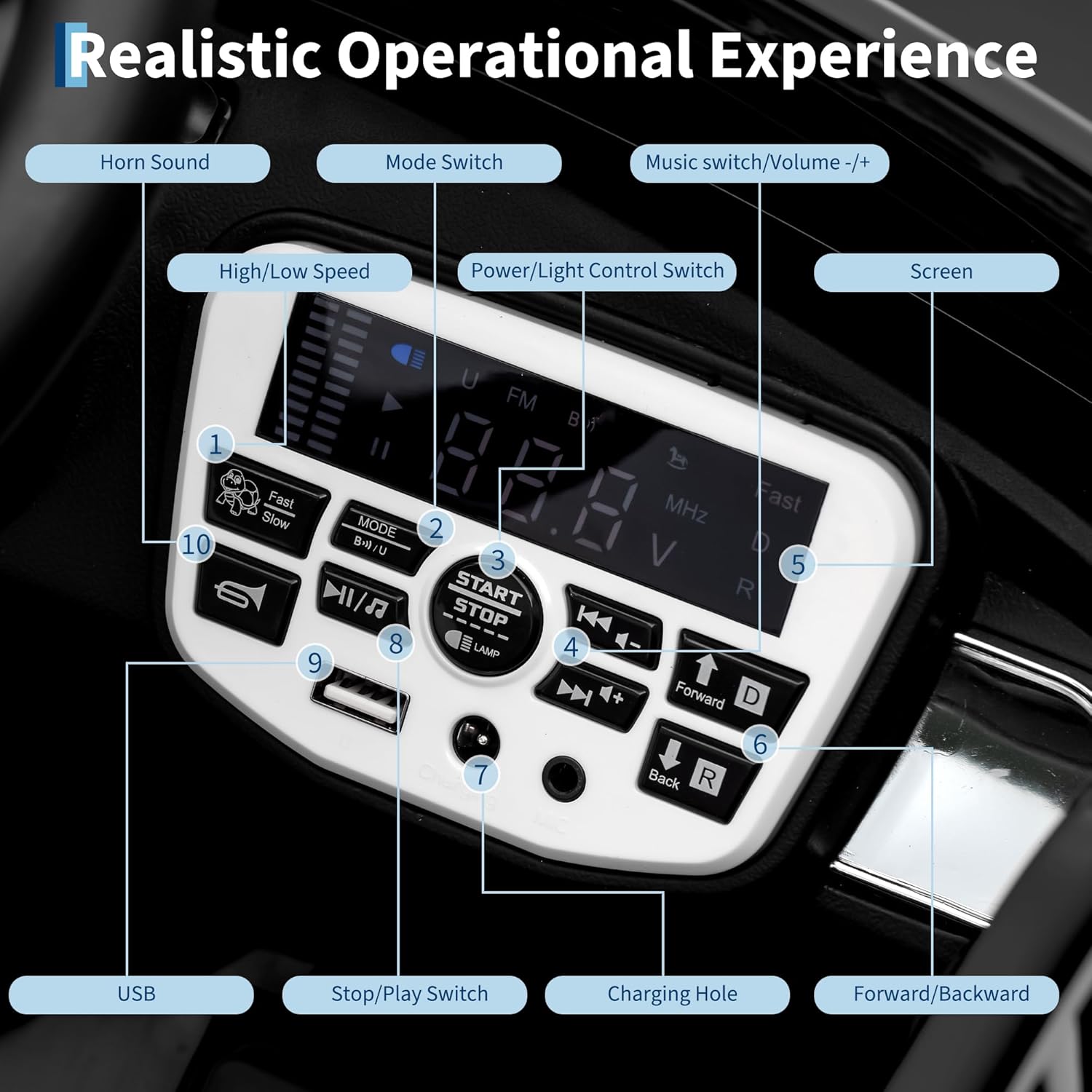- Interactive Entertainment Features. This exciting ride-on car keeps kids engaged with built-in music, realistic horn sounds, and speed variations - plus a USB port to play their favorite songs. The convenient battery meter helps parents monitor power levels for uninterrupted fun