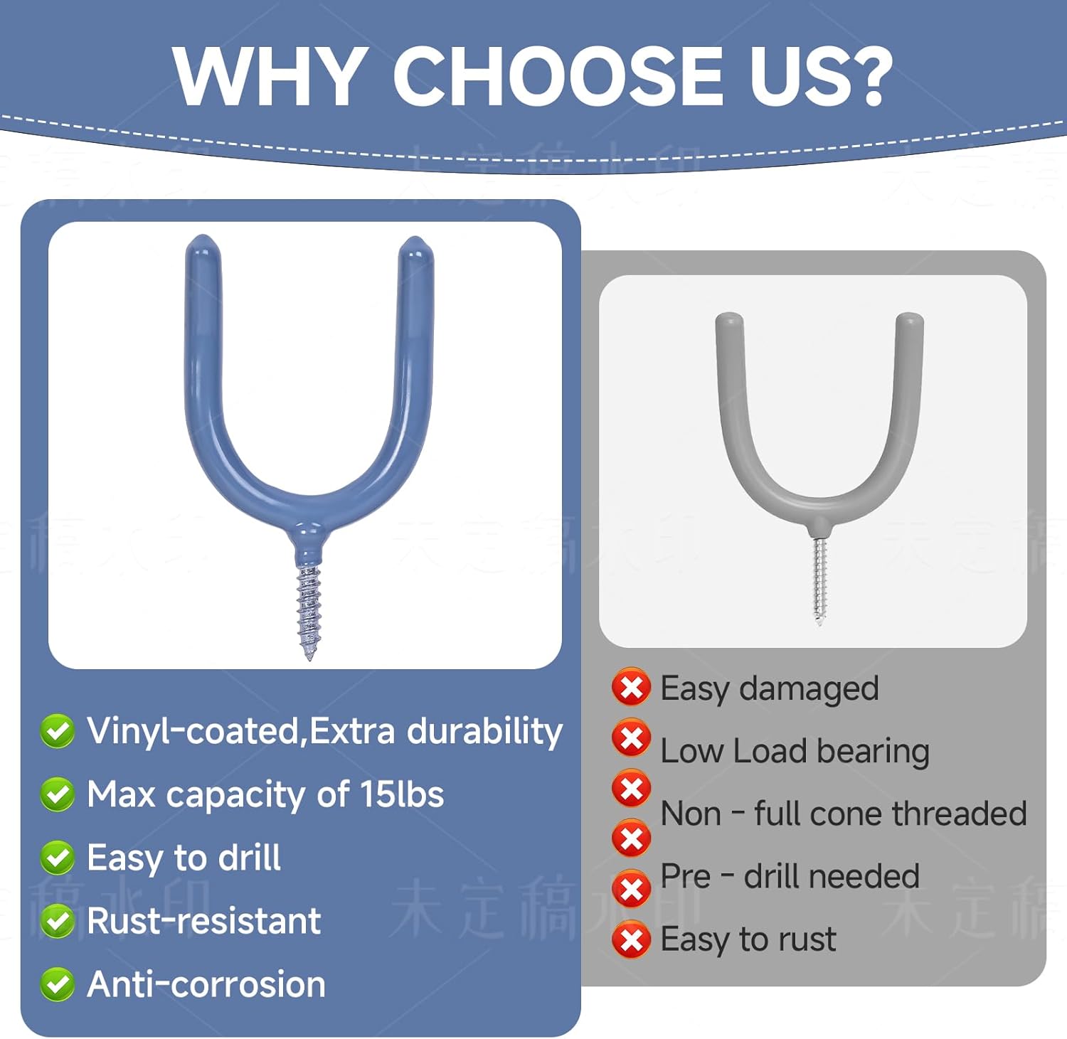 - **Two Mounting Options for Flexibility** *U-shaped hook* slot into pegboards, slat walls, or wire racks. *Screw-in hooks* allow direct wall or ceiling mounting for permanent storage
