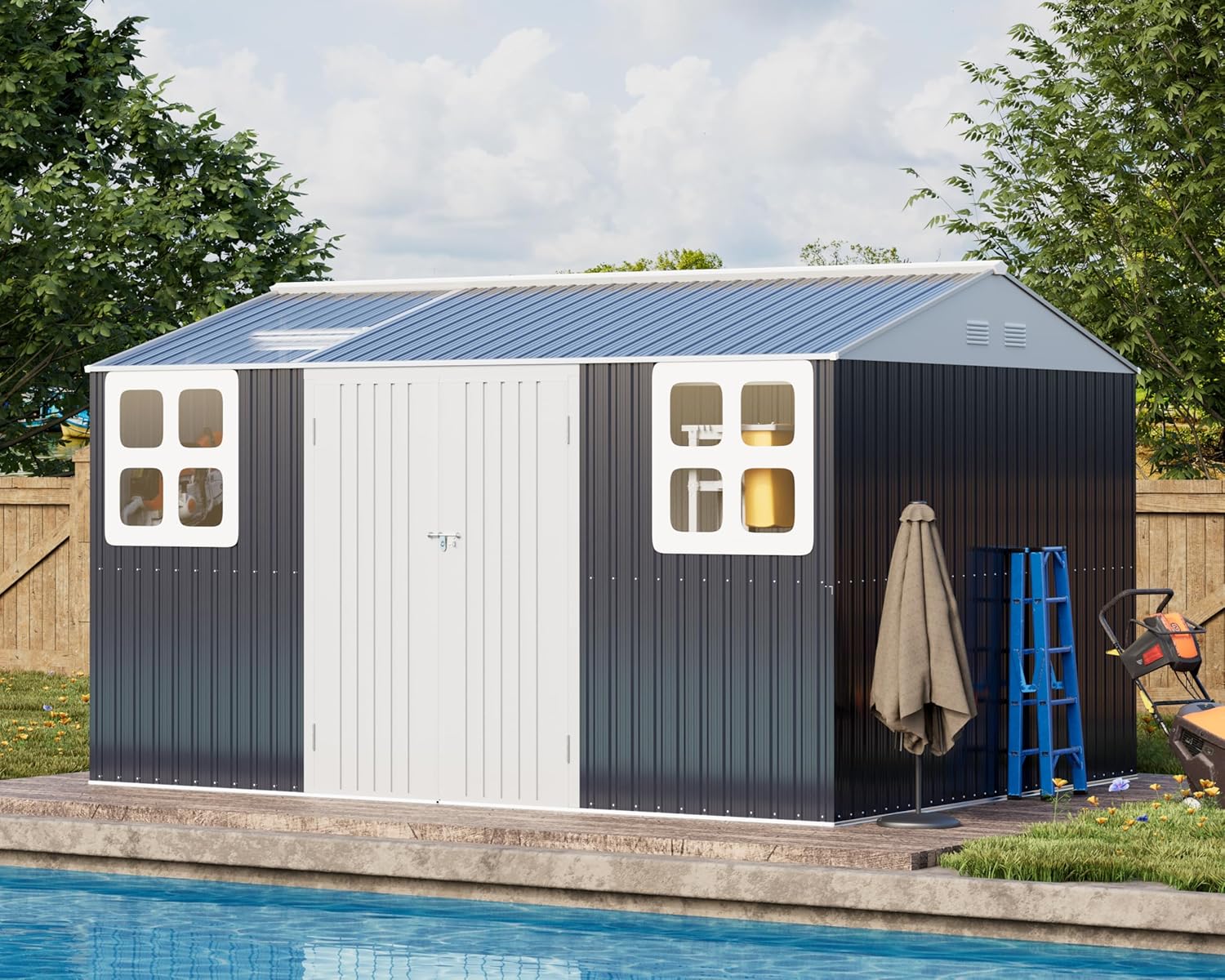 - 🚪 Vast 120 SQ. FT. with Effortless Access: Unlock your full storage potential. With a vast 120 sq. ft. of floor space (12'L x 10'W), this large building accommodates your bulkiest items with ease. The lockable, wide-opening double doors (4.5' W x 5.5' H) ensure effortless access for ride-on mowers, wheelbarrows, and patio furniture. To complete the design, two fixed four-pane windows enhance the interior's ambient light and add a touch of aesthetic appeal to your backyard.