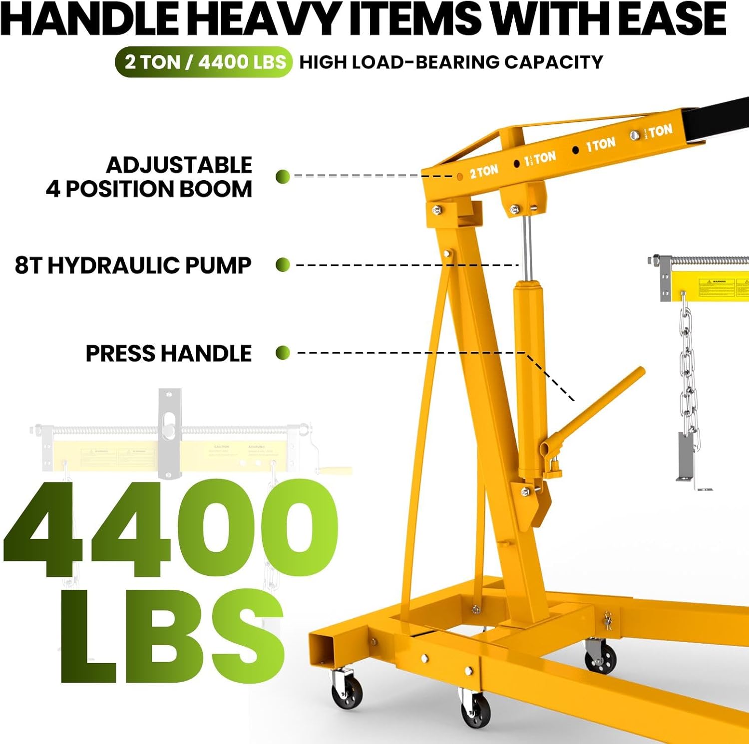 - 【4400 lbs Capacity】Our 2-Ton Engine Hoist effortlessly handles heavy loads, with a 4400 lbs max capacity. Ideal for lifting engines, transmissions, and heavy equipment, it offers reliable performance in garages, workshops, and construction sites.