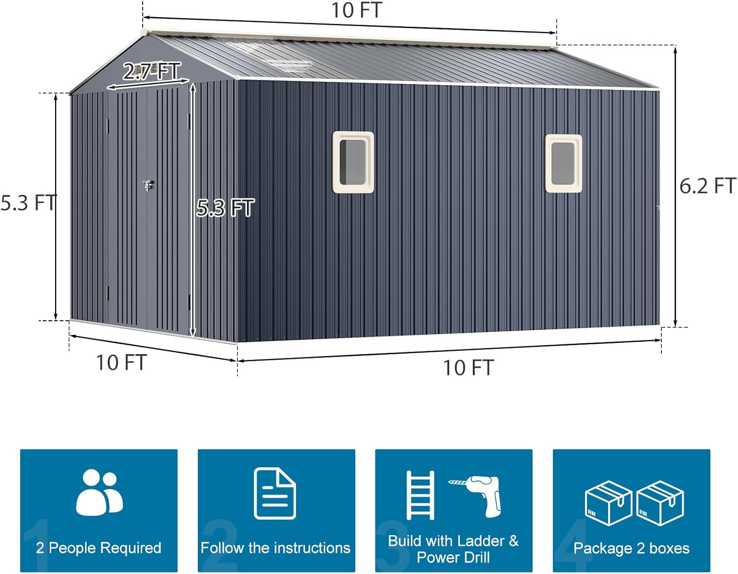10x10 FT Metal Shed Large Waterproof Outdoor Tools Storage with Clear Roof Windows Air Vent Door for Outside Garden Patio Lawn Backyard to Store Bikes,Lawnmower,Garage,Dark Grey