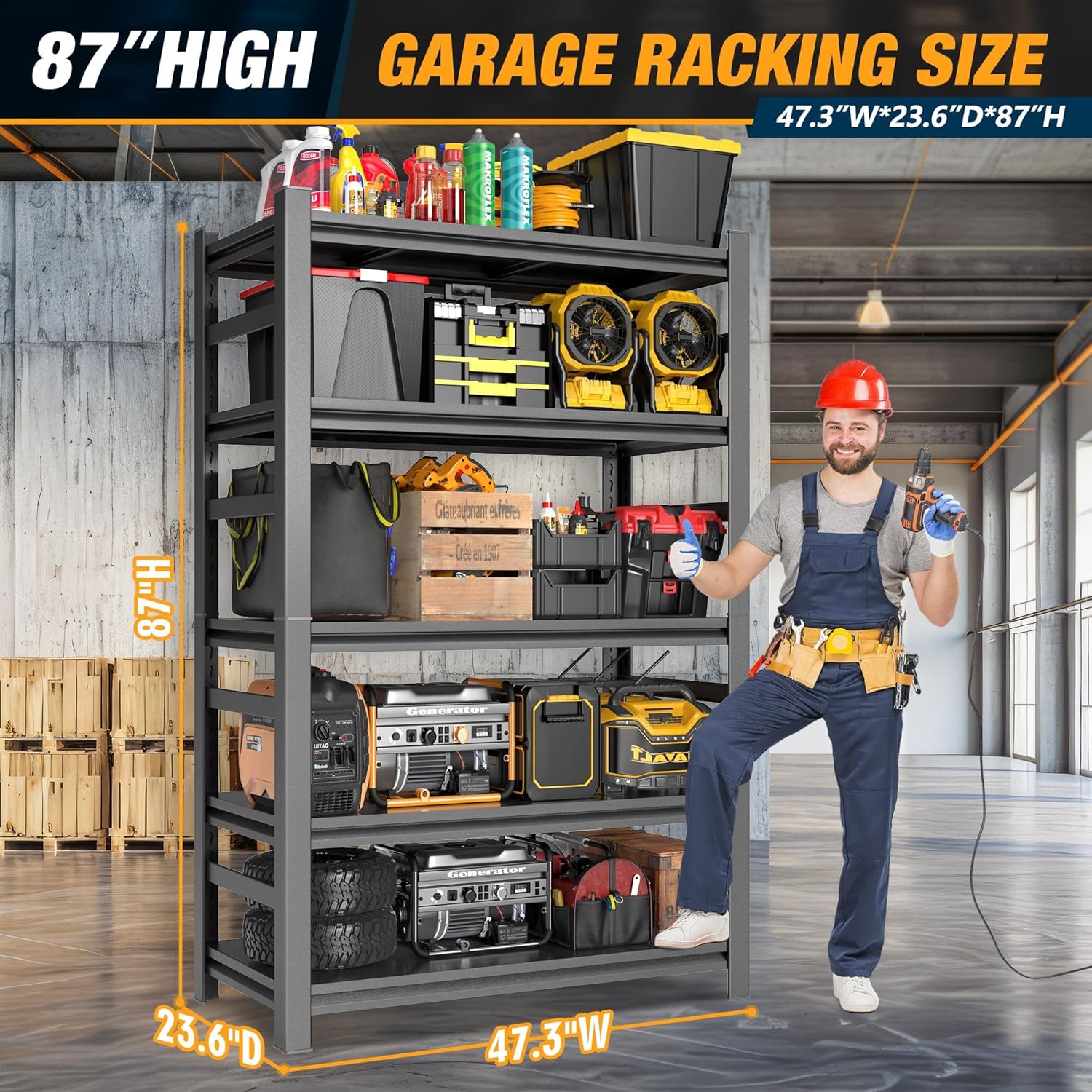 - ăHeavy-Duty Industrial ConstructionăCrafted with ultra-durable steel and reinforced cross beams, this 87''H commercial shelving unit delivers unmatched strength for demanding storage needs. Each shelf holds up to 750 lbs, ensuring reliable support for heavy tools, equipment, bulk supplies, or seasonal items. Perfect for warehouses, garages, and industrial settings.
