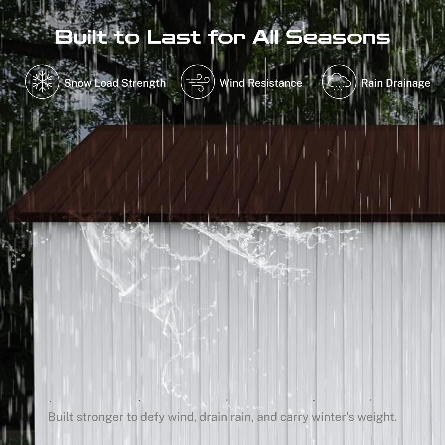 - β [Sloped Roof for Superior Weather Protection] Designed for real-world conditions, the efficient sloped roof system guarantees optimal rainwater drainage, preventing damaging pooling and leaks. This key feature in our storage buildings and sheds clearance design minimizes maintenance and ensures your tools, equipment, and belongings stay consistently dry inside