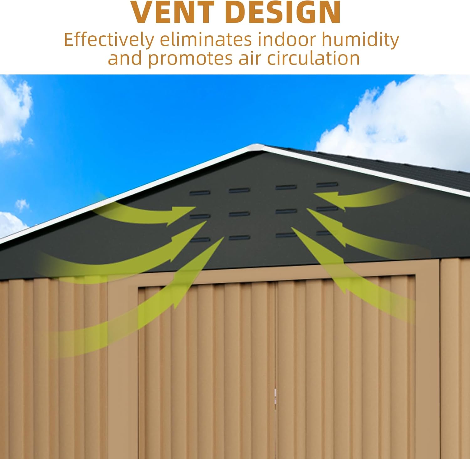 - Weatherproof & Damp-Resistant: The weatherproof garden shed features a sloping roof to prevent water pooling and galvanized steel panels that resist rust, rain, and UV damage. Proper ventilation reduces condensation, keeping stored items dry.