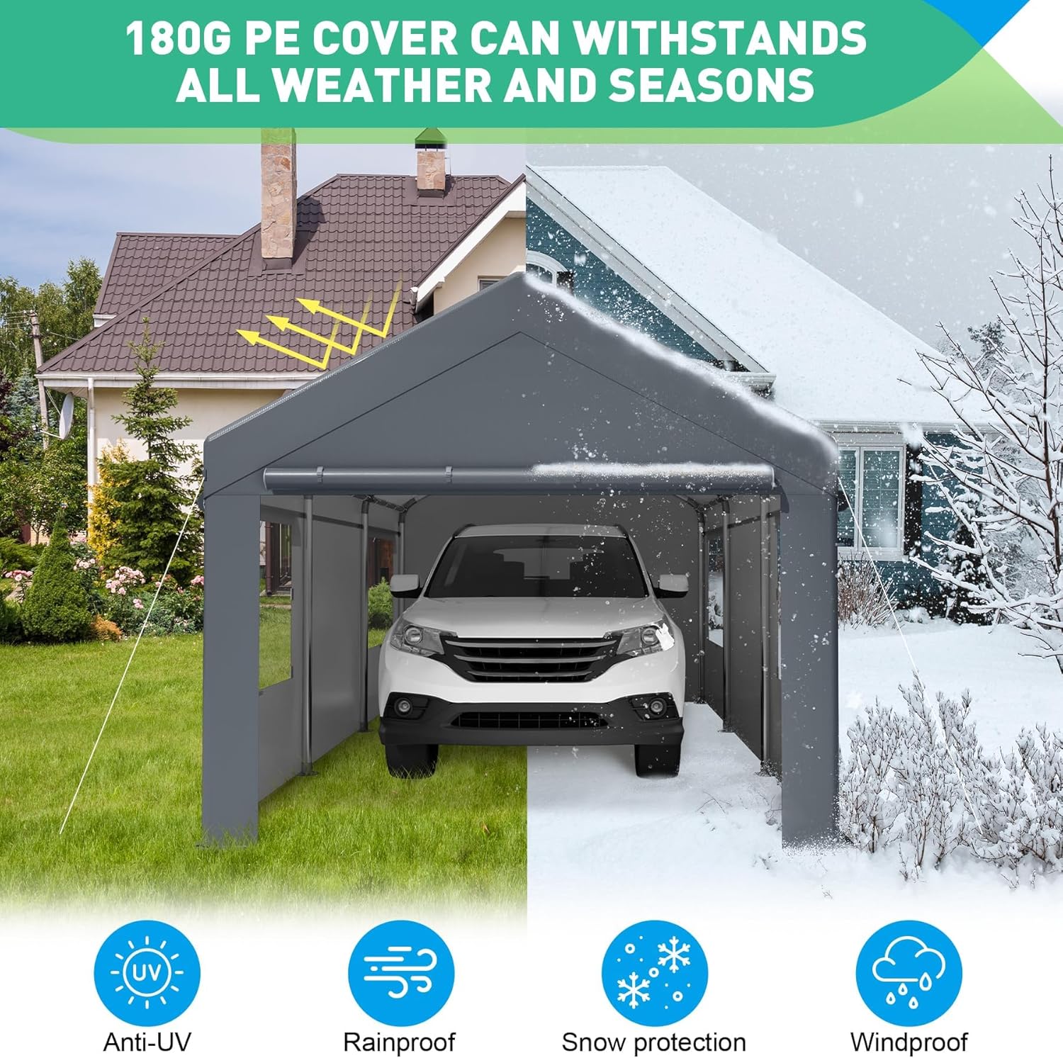 - 【ALL-SEASON PROTECTION FROM THE ELEMENTS】: Stay shielded year-round with the 180g waterproof canopy cover, crafted from extra-thick polyethylene fabric. This heavy duty all weather carport tent protects vehicles from sun, rain, dust, hail, and snow, preserving their condition. As a versatile 12 x 20 canopy tent, it delivers reliable defense against the elements, ensuring your car, boat, or bike remains safeguarded.